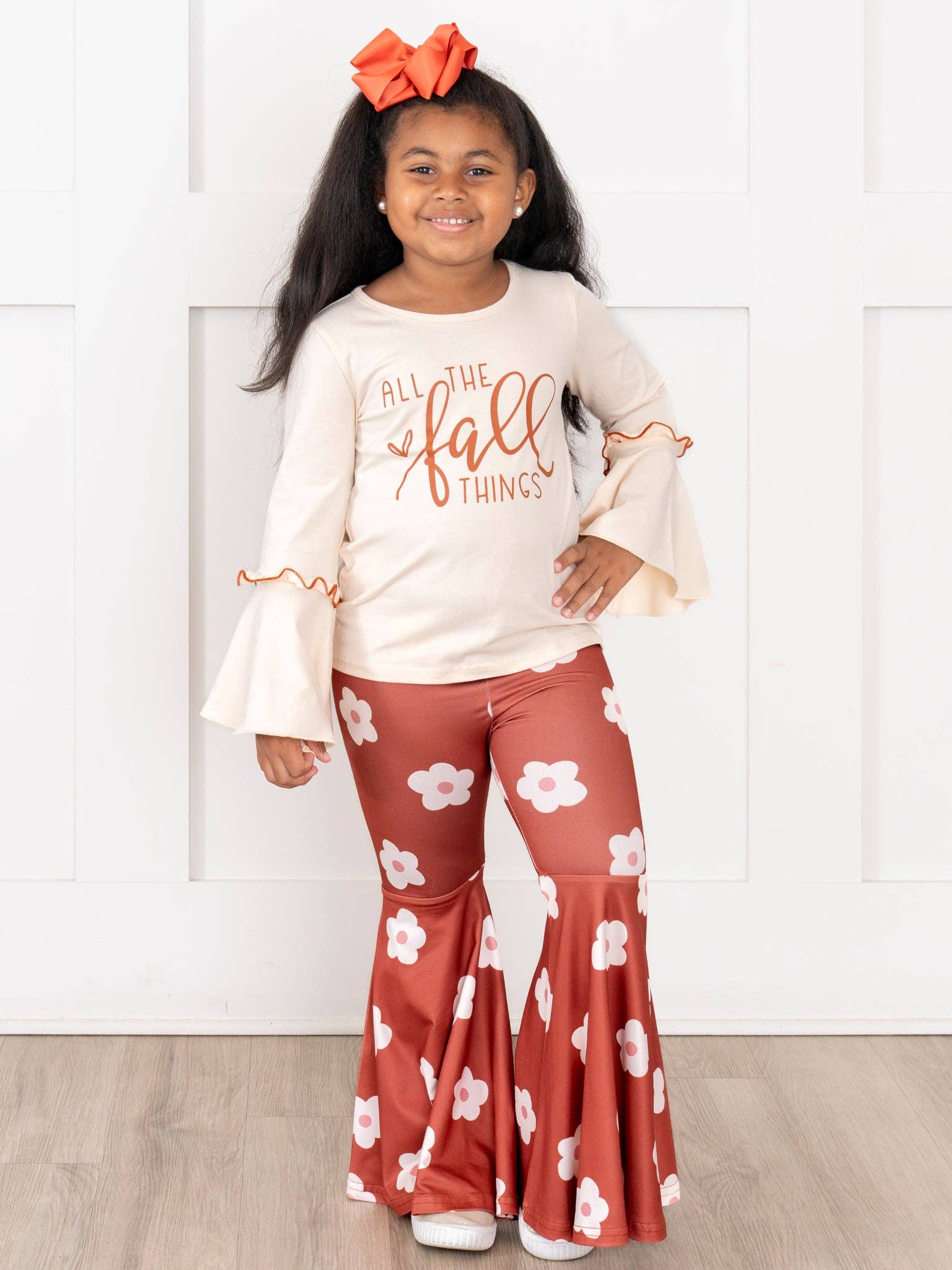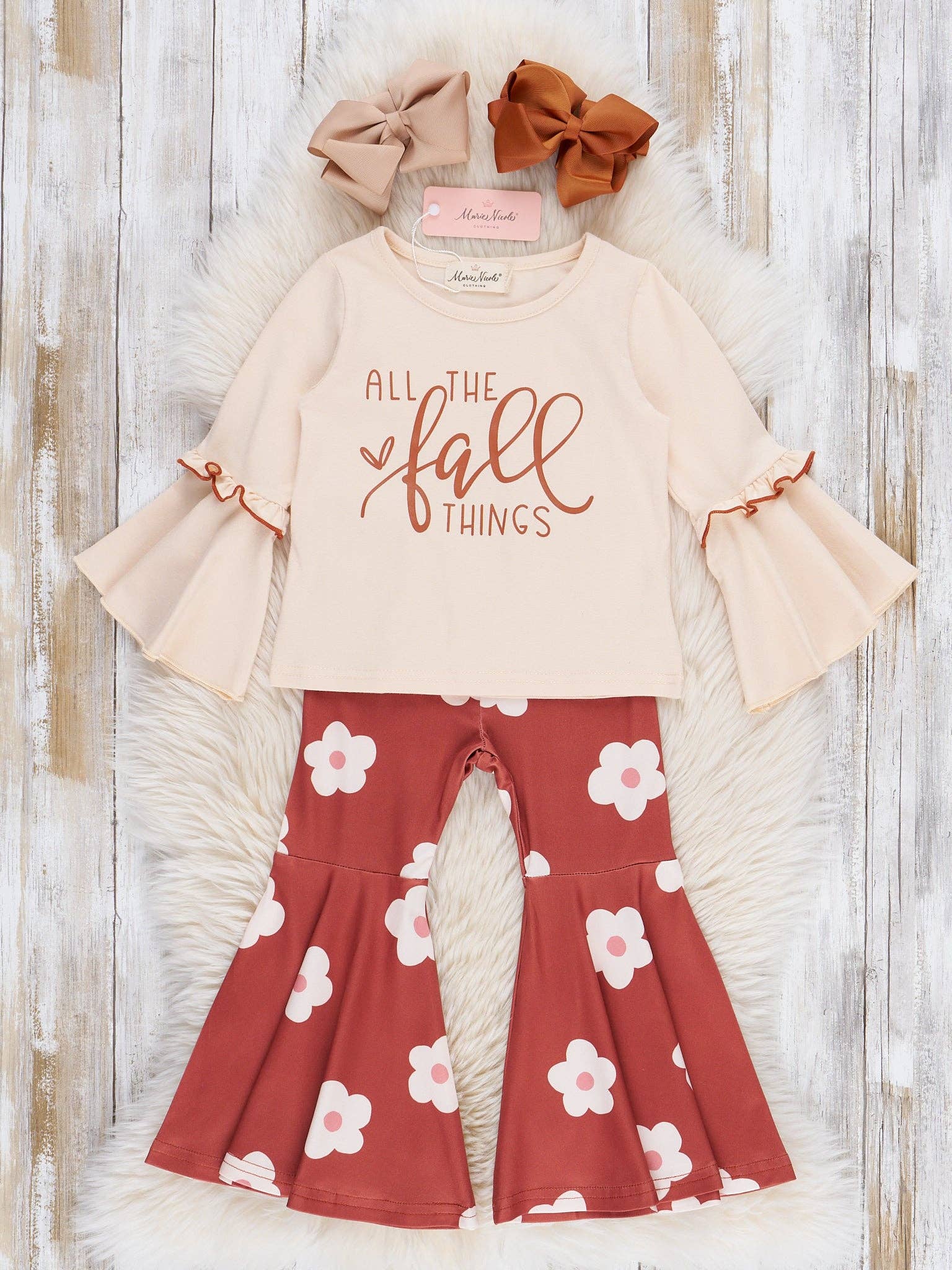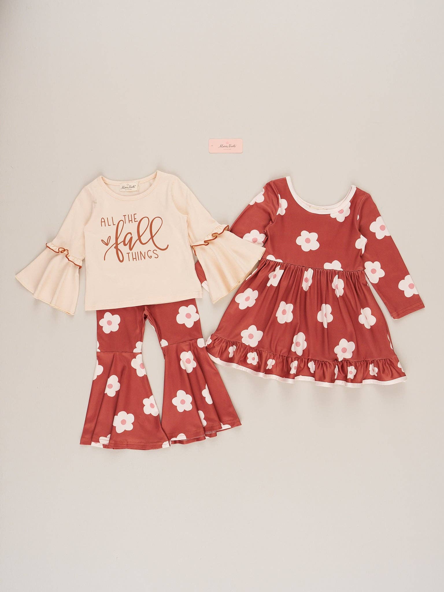 The "All the Fall Things" Floral Outfit is a cozy and charming set that captures the magic of the season. Featuring a beautiful fall flower print in warm, autumn-inspired tones, this outfit from Marie Nicole Clothing is finished with flare accents for an extra touch of seasonal charm. Soft, breathable, and perfect for everything from pumpkin patches to playdates, it’s made for twirls, giggles, and all the fall things she loves.