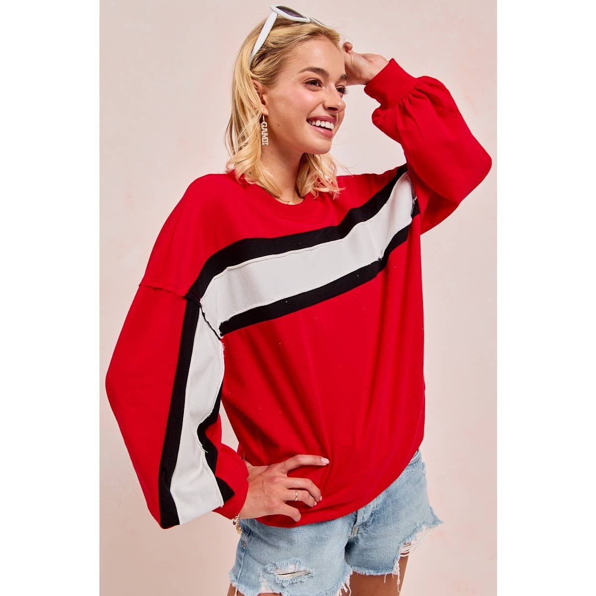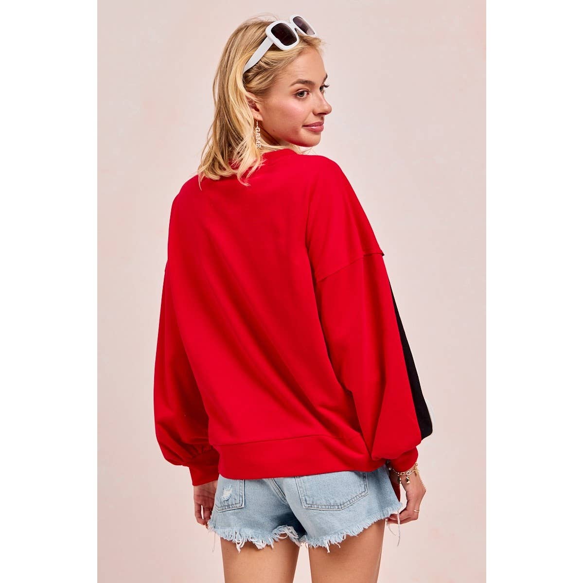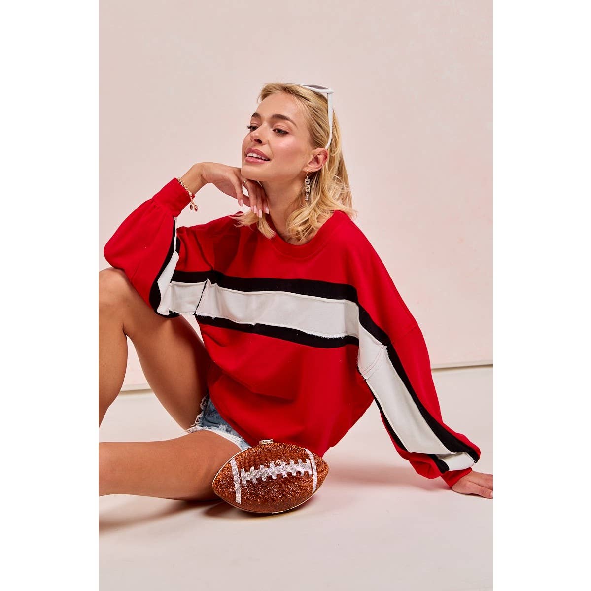 Show off your team spirit in comfort with the Gameday Theme French Terry Color Block Top, a sporty and stylish essential for casual outings or cheering from the sidelines. Crafted from soft French terry fabric, this top features bold color block panels and playful gameday-themed details that add a fun, energetic touch. With its relaxed fit and cozy feel, it's perfect for pairing with jeans, shorts, or joggers for a laid-back, fan-ready look.