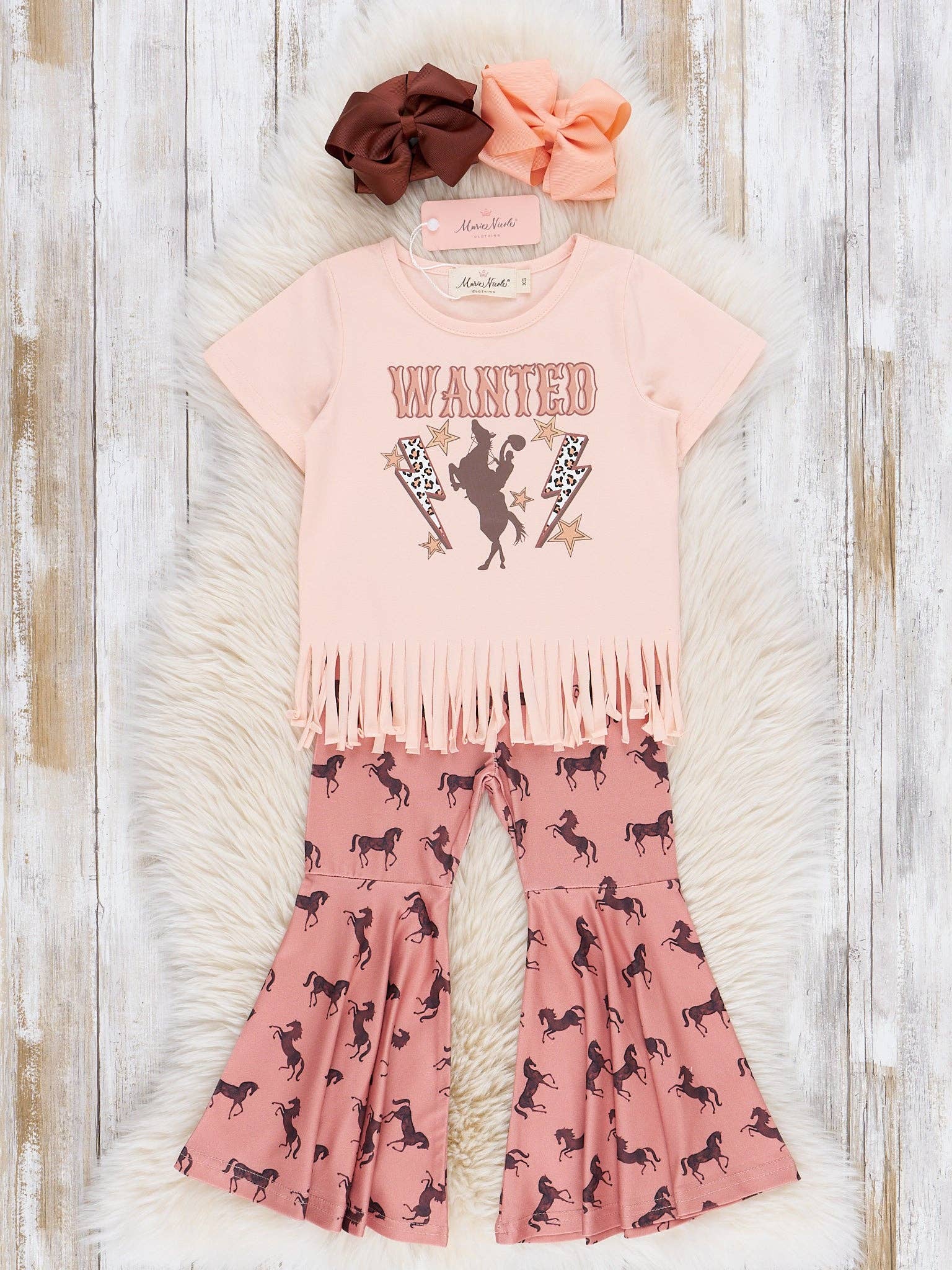 The perfect outfit for your sassy cowgirls! This outfit features a light peach top with a darling "wanted" detail, fringe across the bottom, & brown bell bottoms with horse detailing.